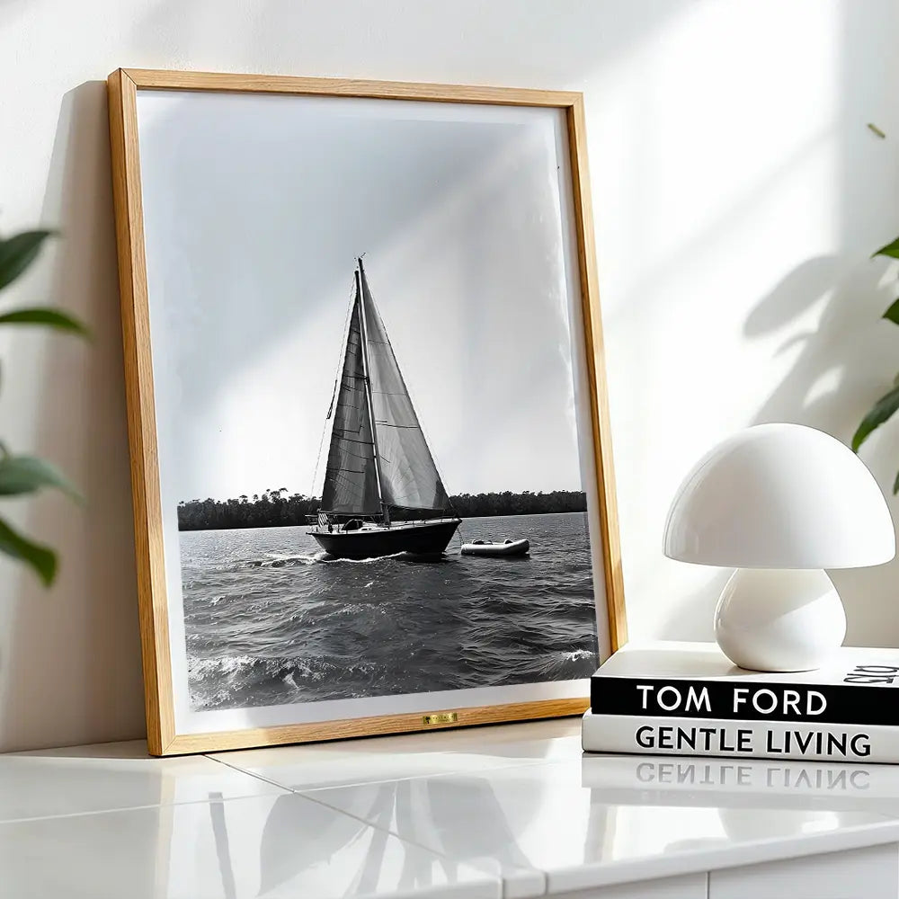 A tranquil sailboat drifting across calm waters, a vision of peace and freedom.