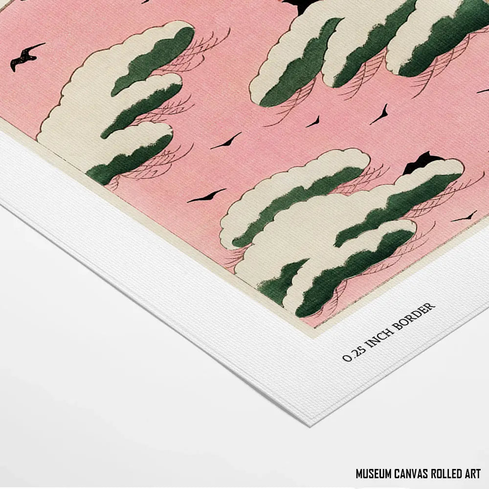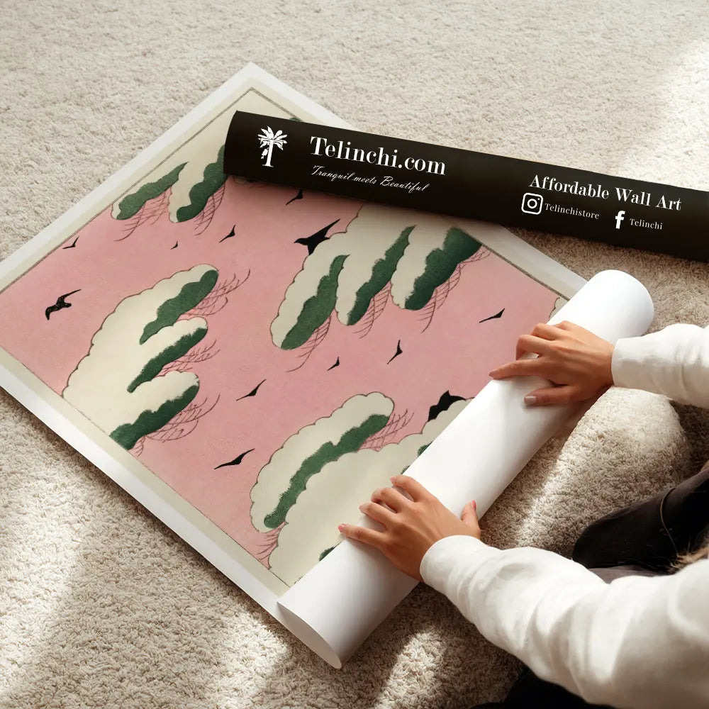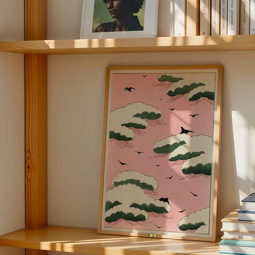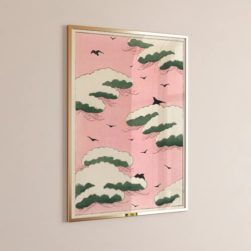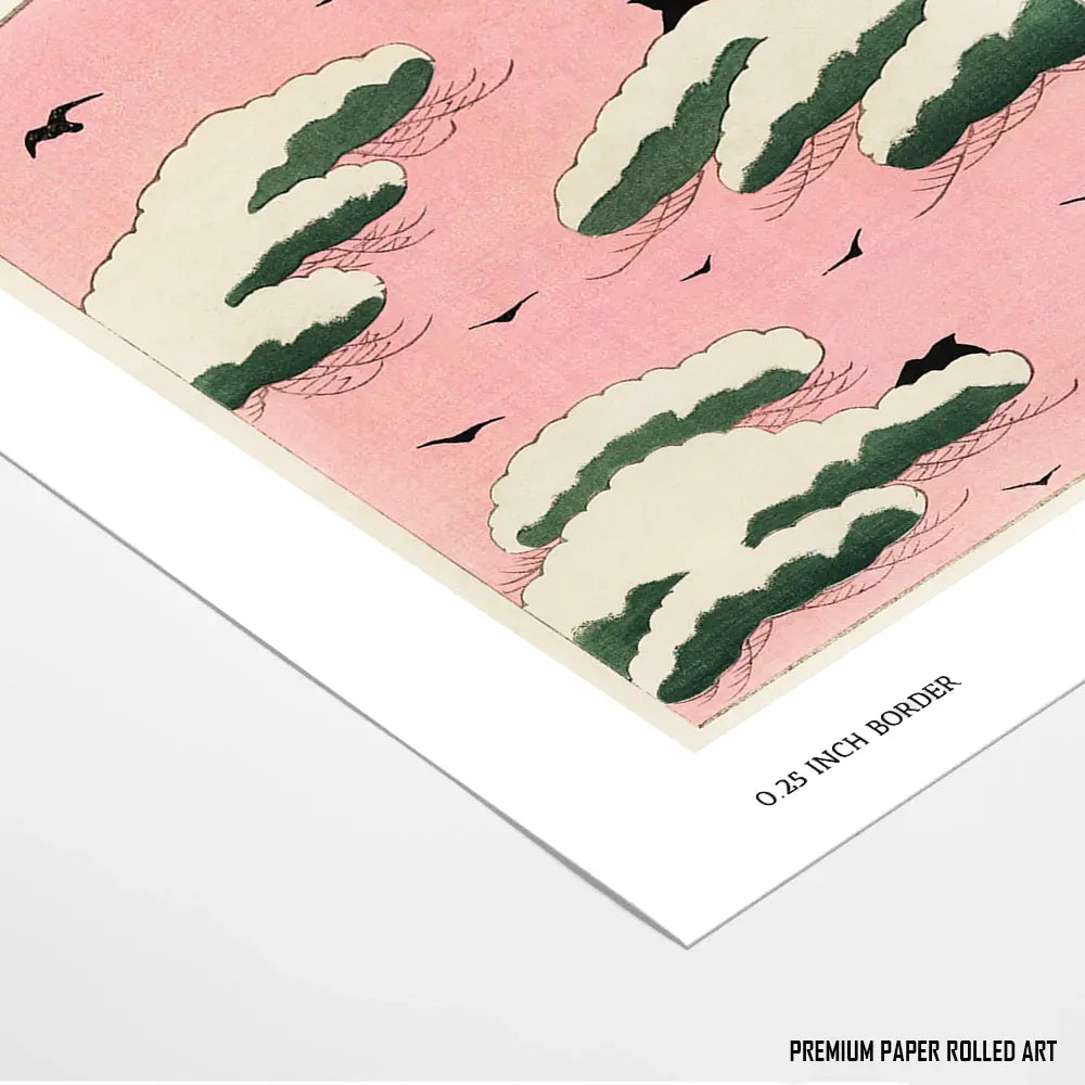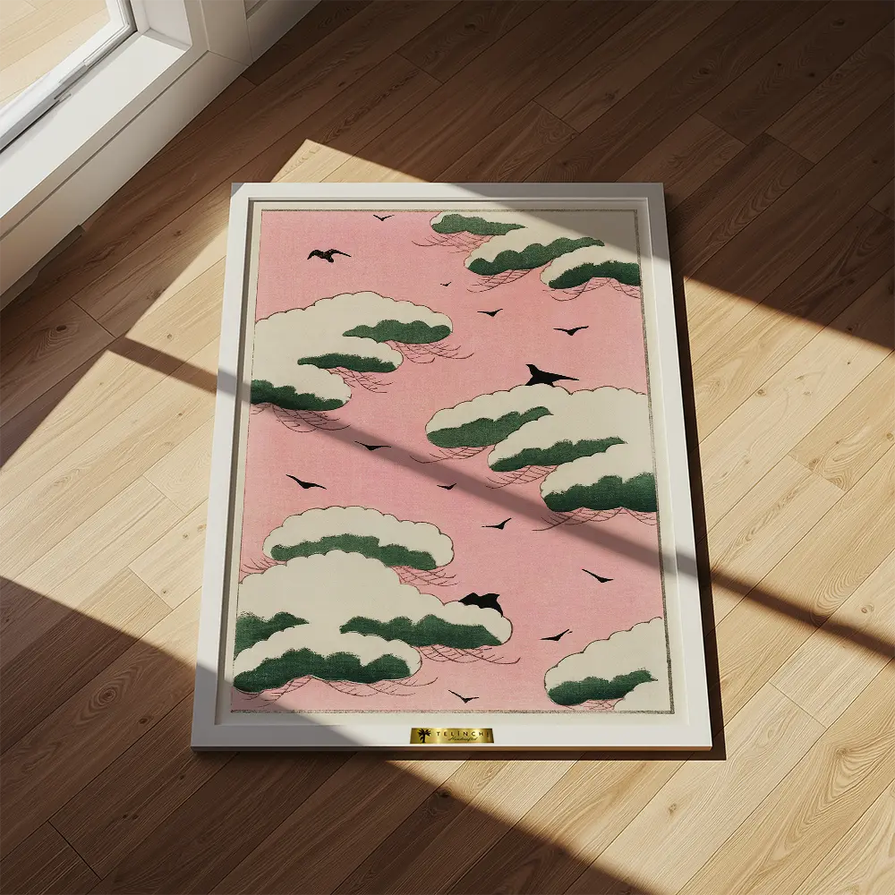 Fluffy clouds and soaring birds create a whimsical sky, blending traditional Japanese aesthetics with playful charm.