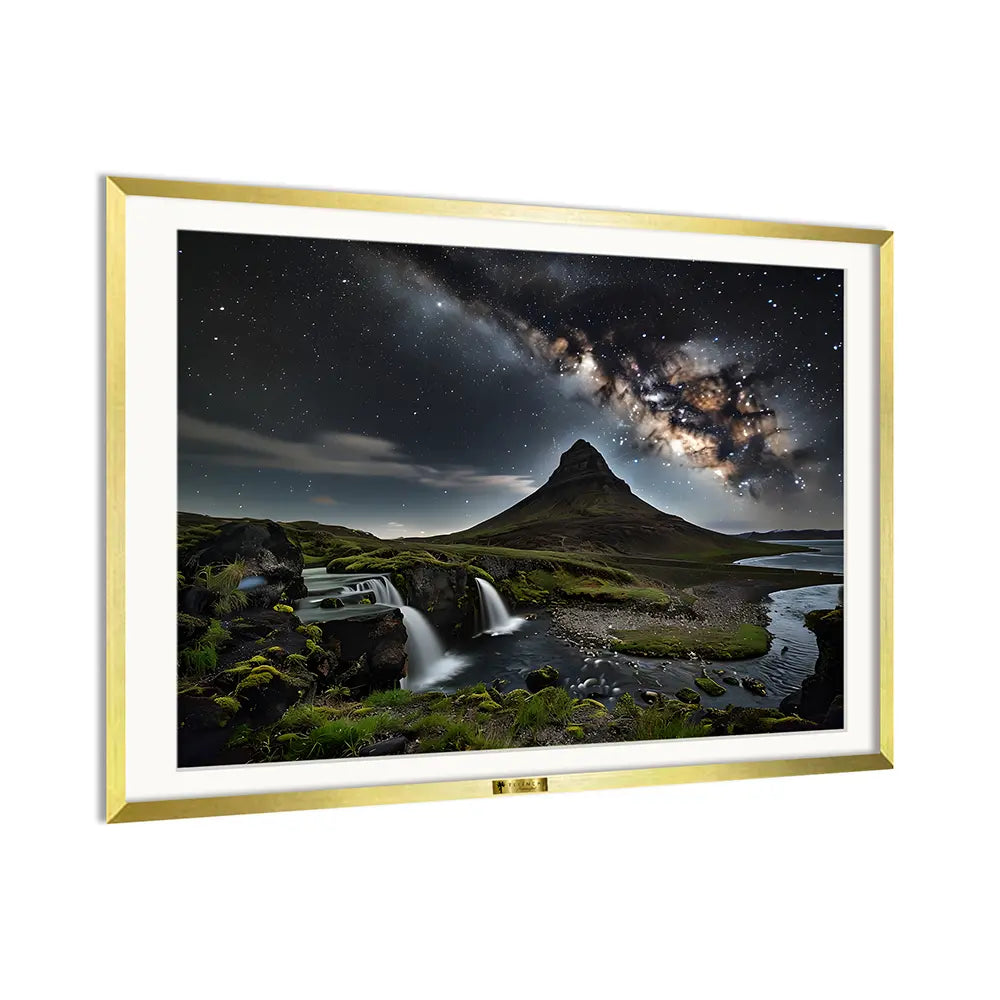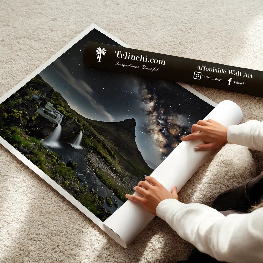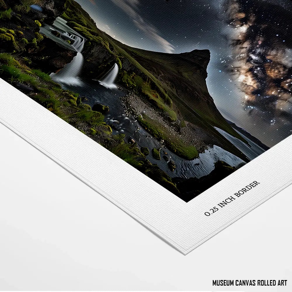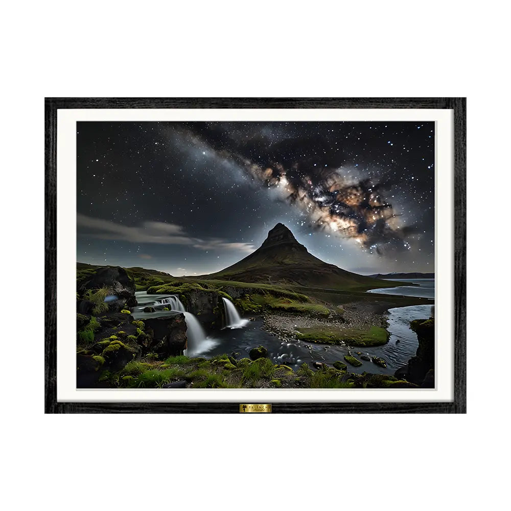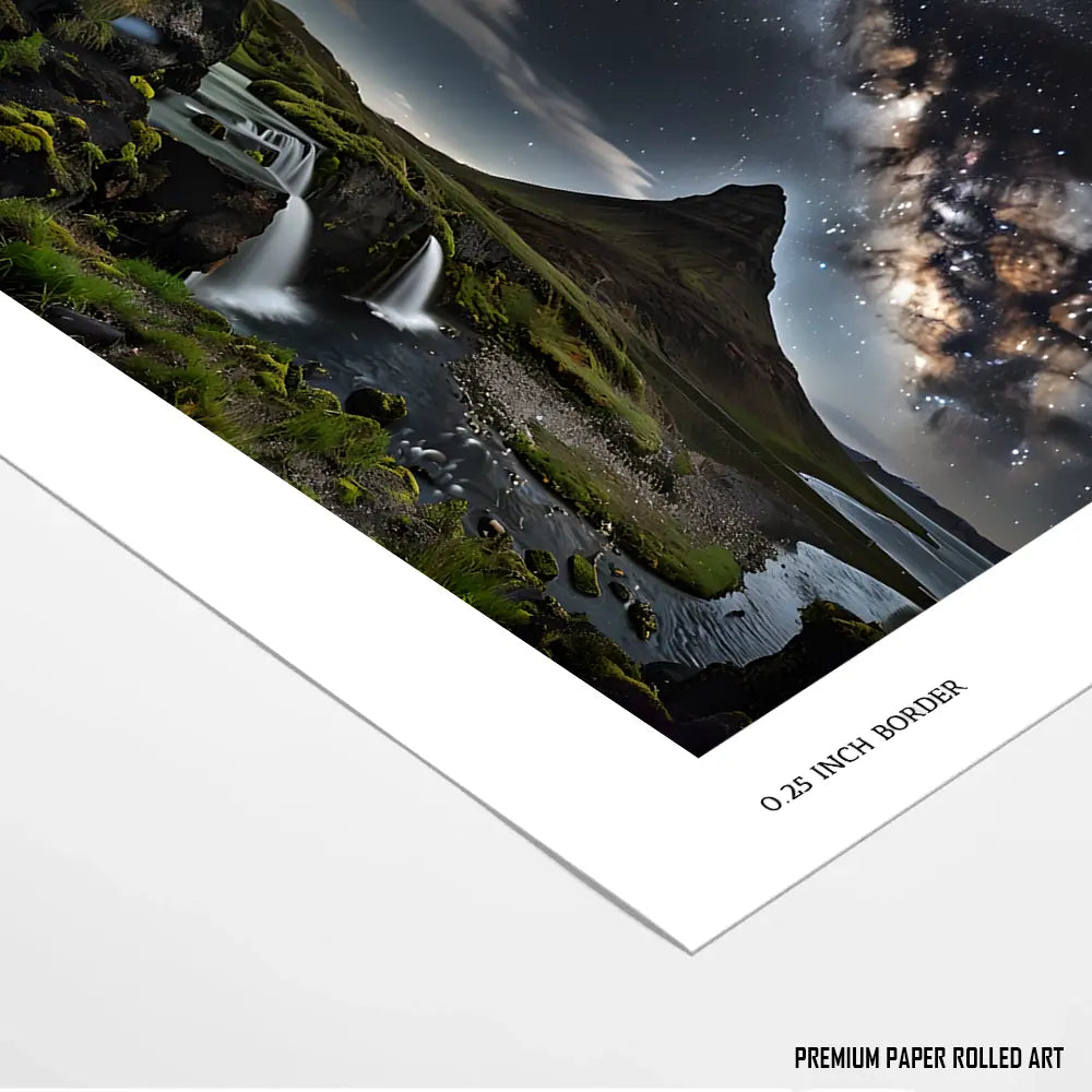 A cosmic waterfall under a starry sky, bridging earth and the heavens.
