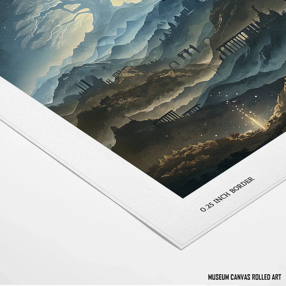 A mystical tree overlooking ancient ruins on serene mountains, radiating divine calm and wonder.