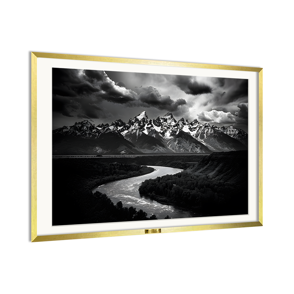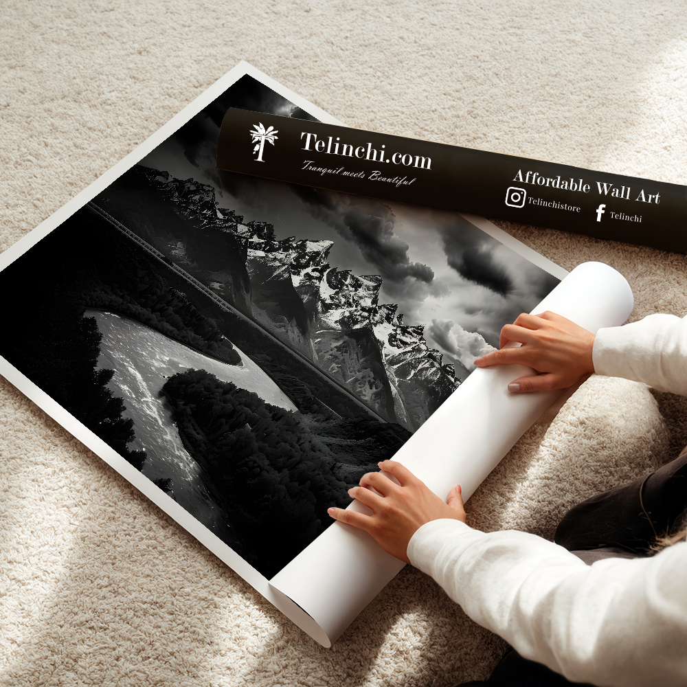A stunning monochrome depiction of towering peaks and flowing rivers.
