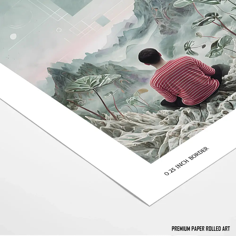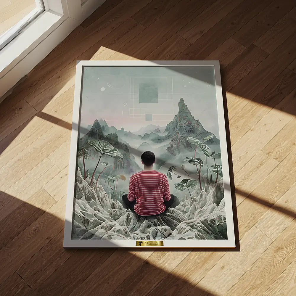 A tranquil figure meditating amidst surreal mountain vistas.
