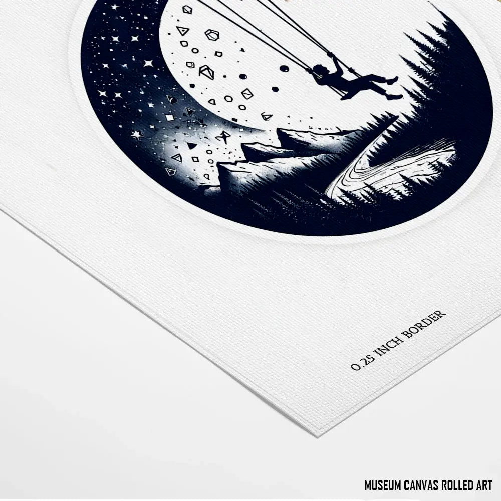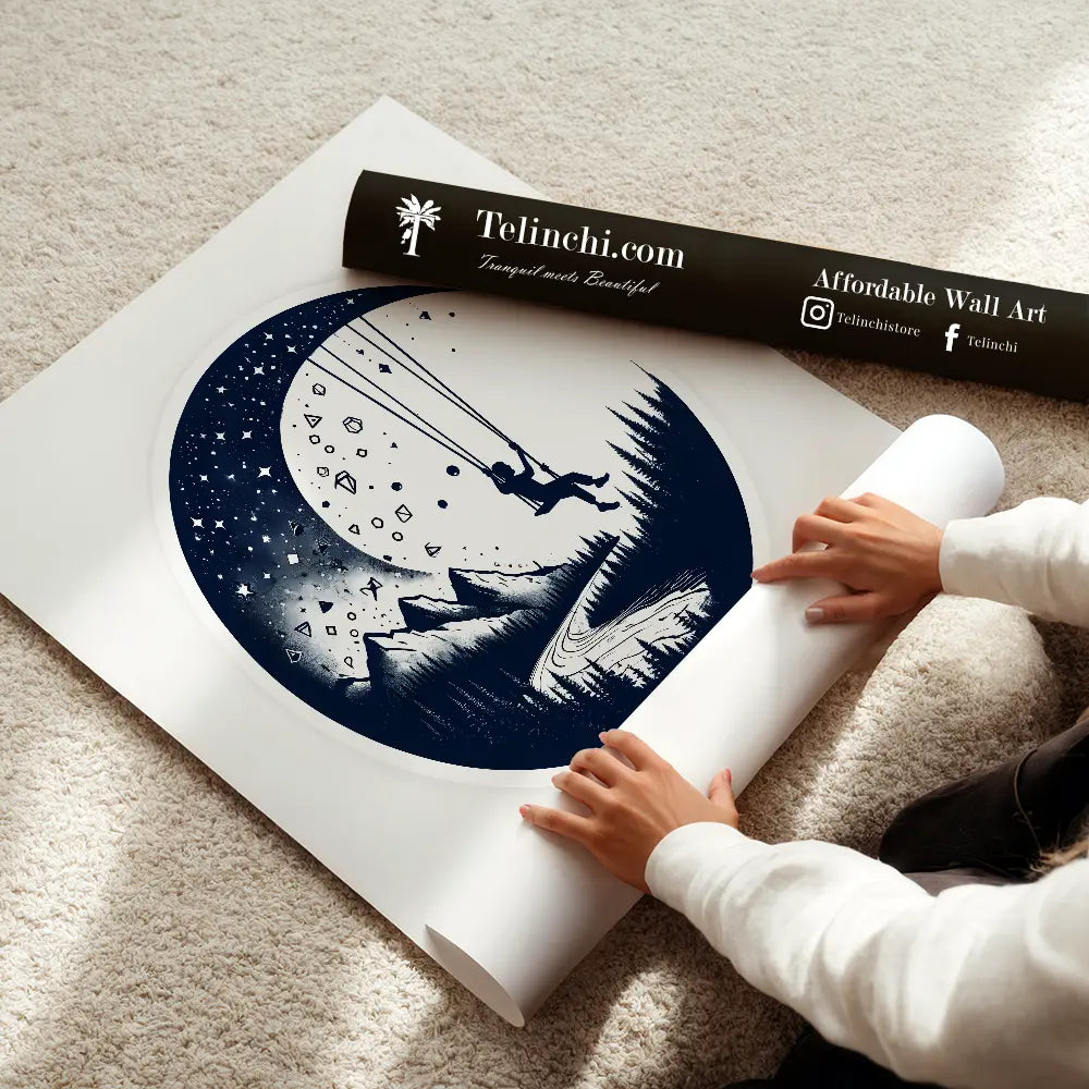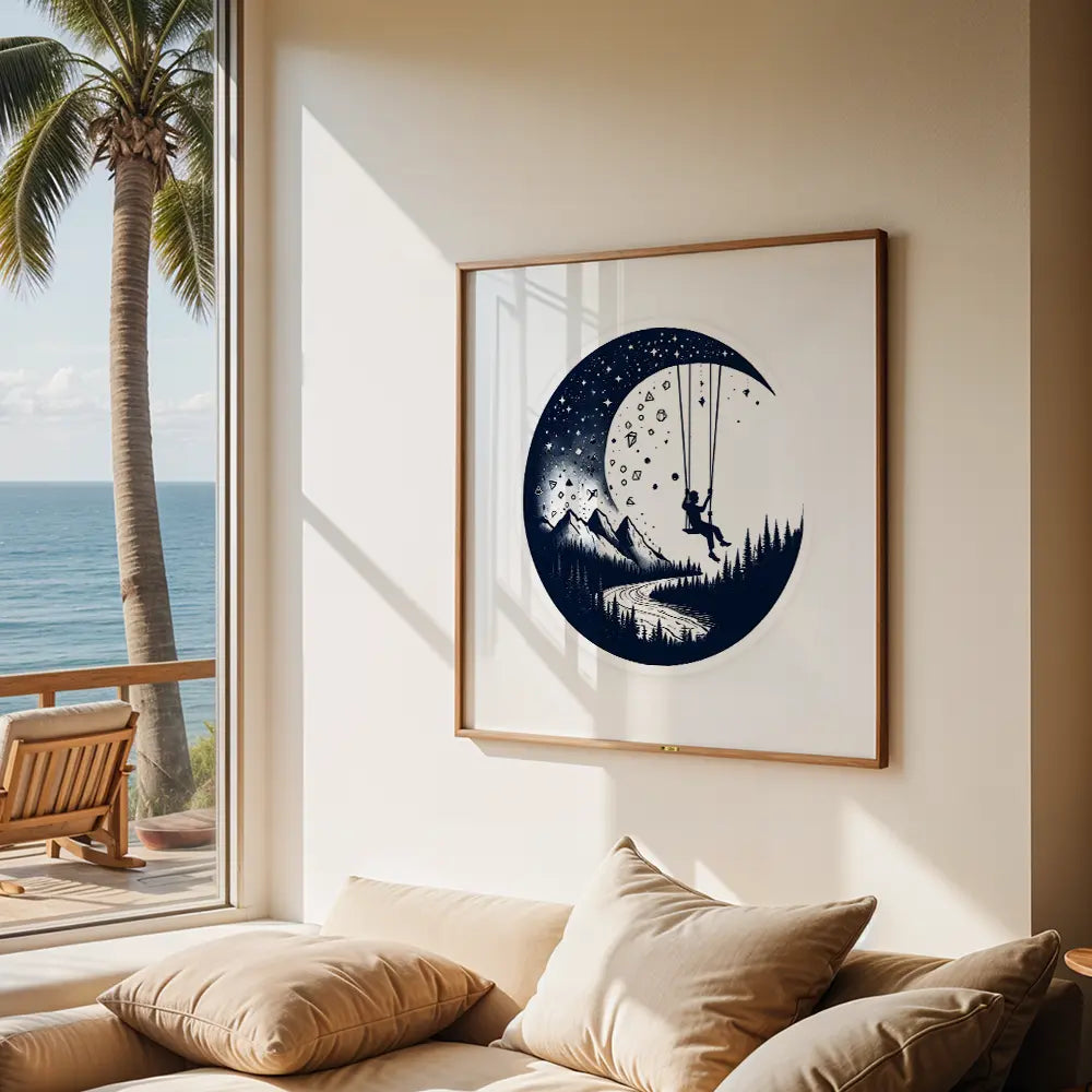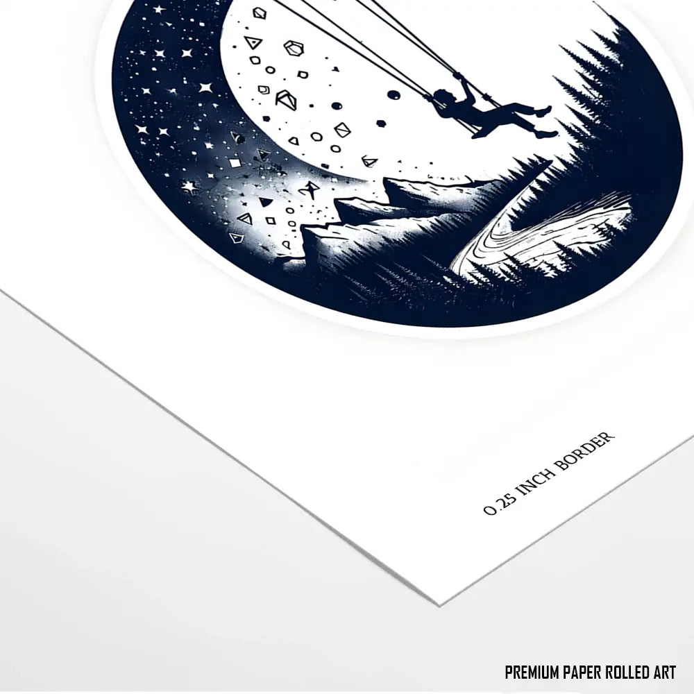 A crescent moon, filled with a starry night sky, forms a circular frame for the artwork. Inside, a lone figure sits on a swing suspended from the moon's edge.