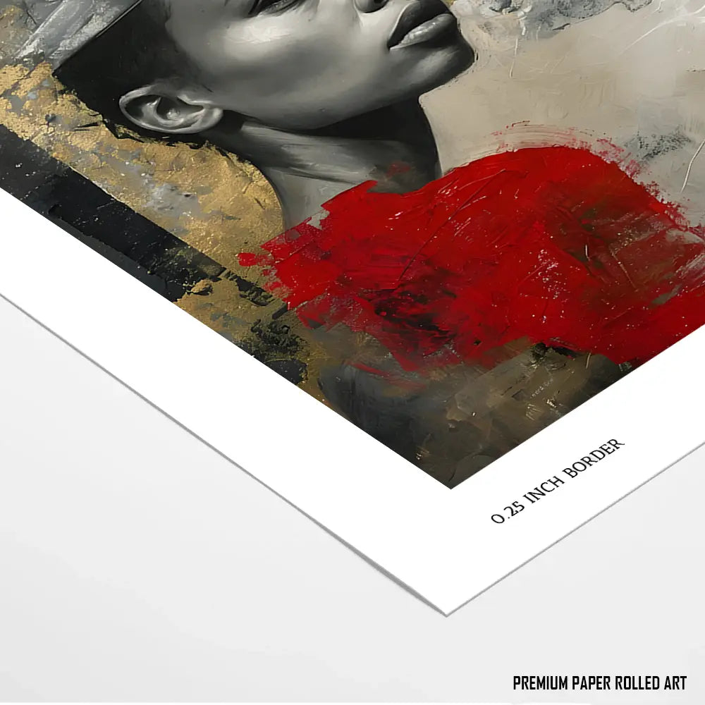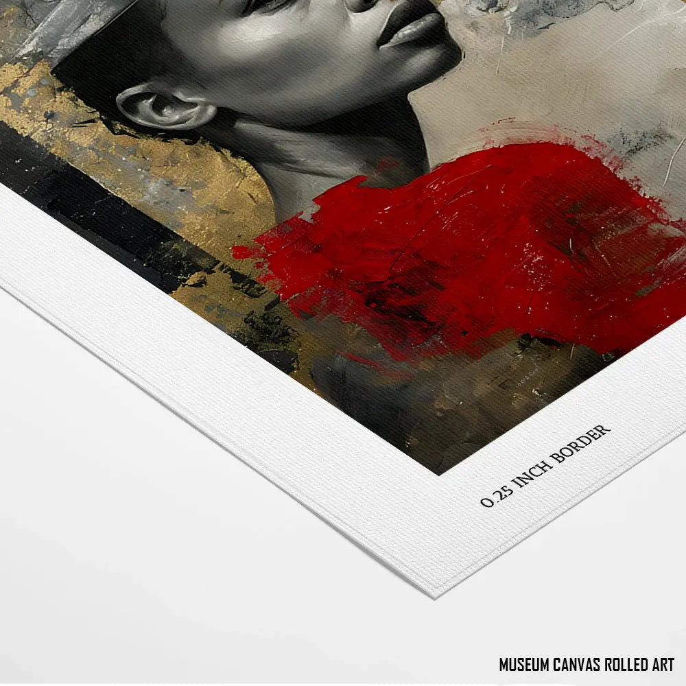A dramatic portrait combining gold and red accents with a determined expression, symbolizing resilience and success.