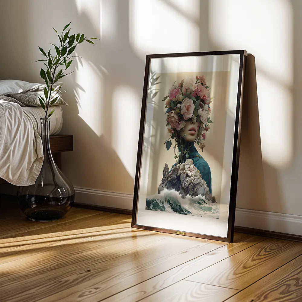 A surreal portrayal of a floral-crowned woman rising from ocean waves, embodying natures essence.