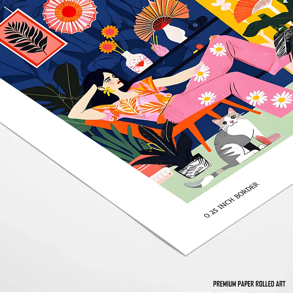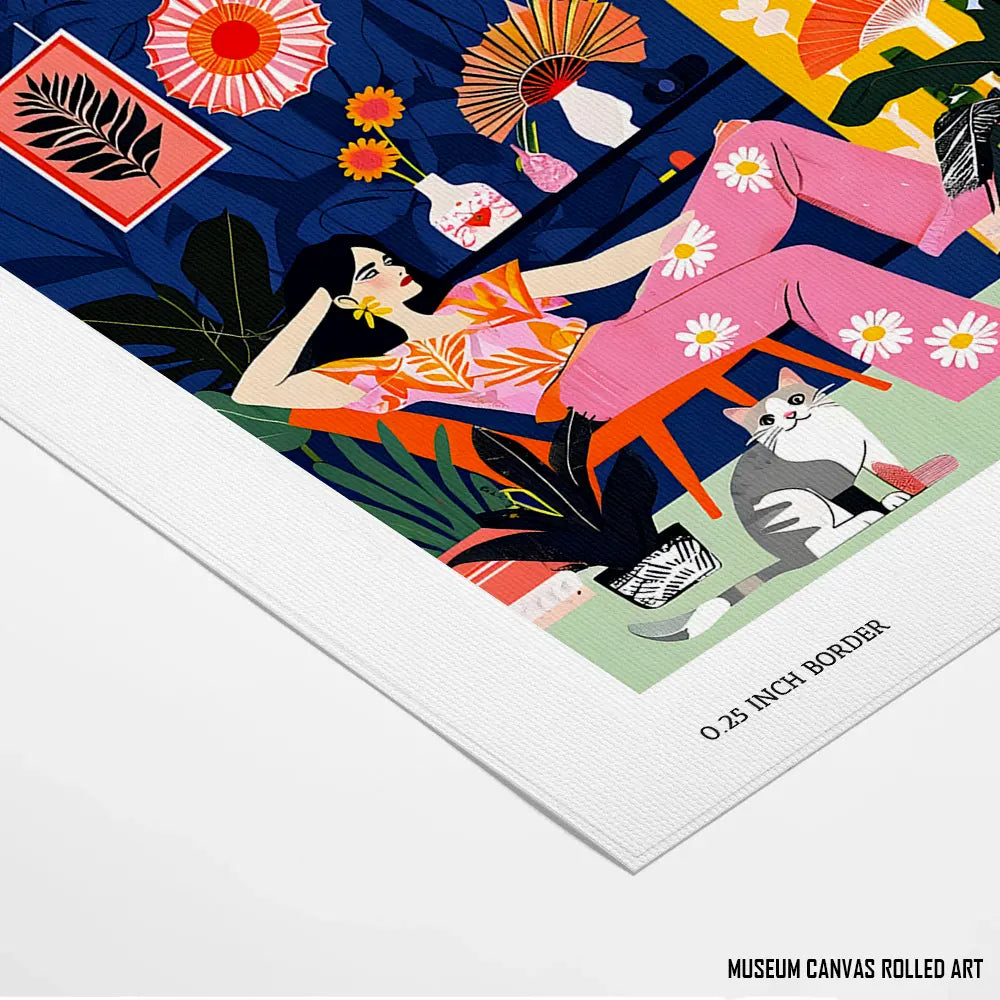 A cozy corner filled with plants, vibrant colors, and playful cat energy.