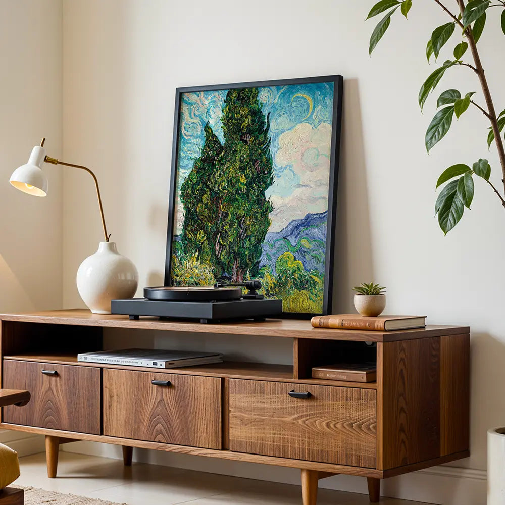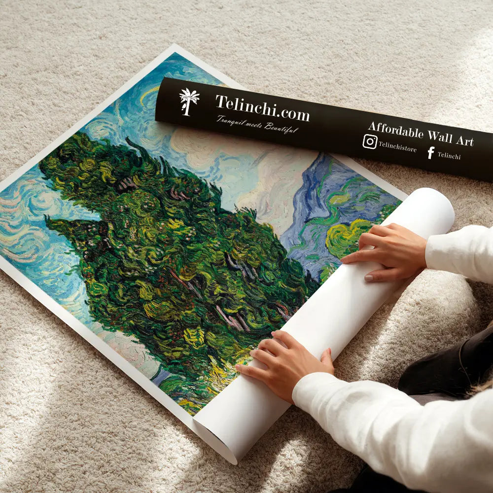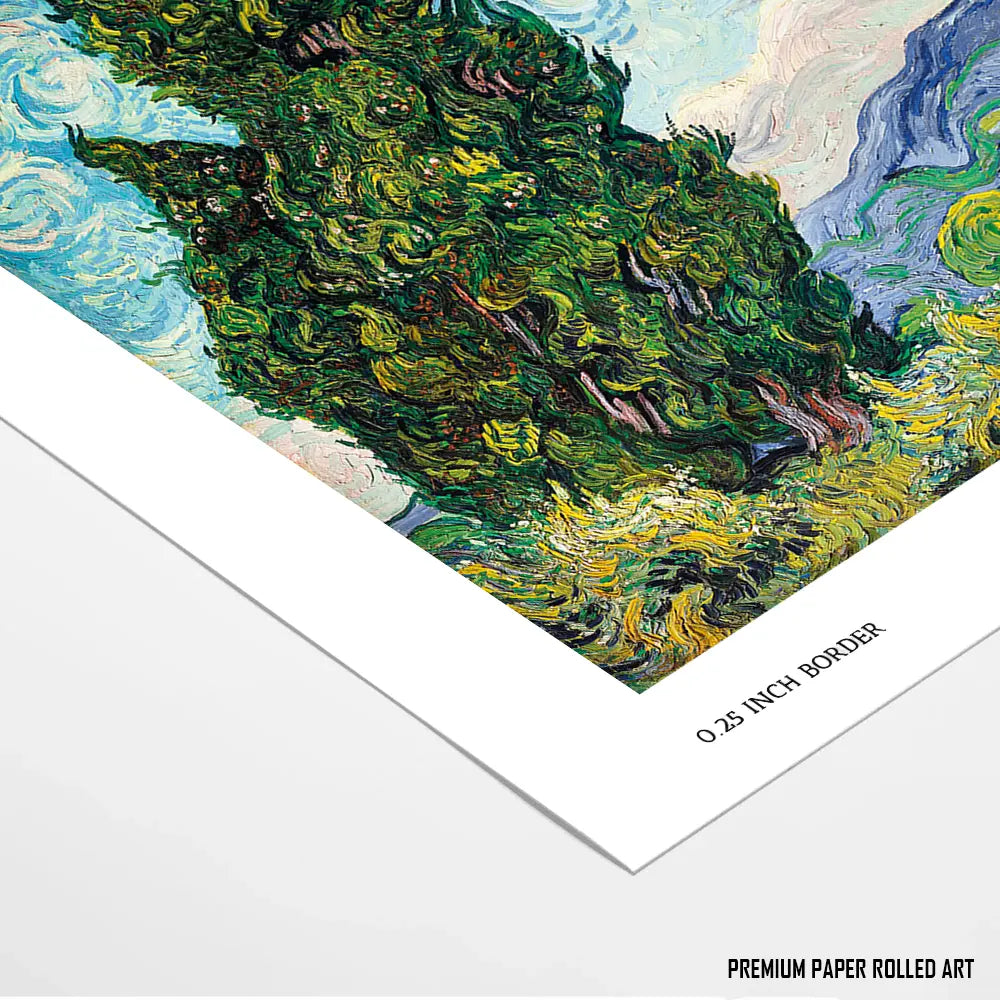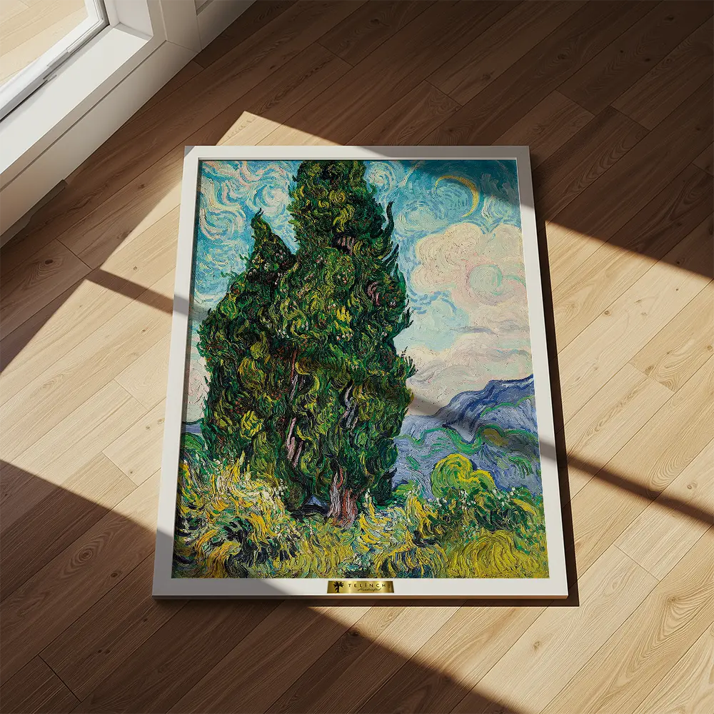This Van Gogh masterpiece showcases the swirling textures and vibrant energy of nature. The cypress trees rise majestically against a dynamic sky, embodying the artist's emotional connection to the landscape. It is a powerful representation of movement and vitality.