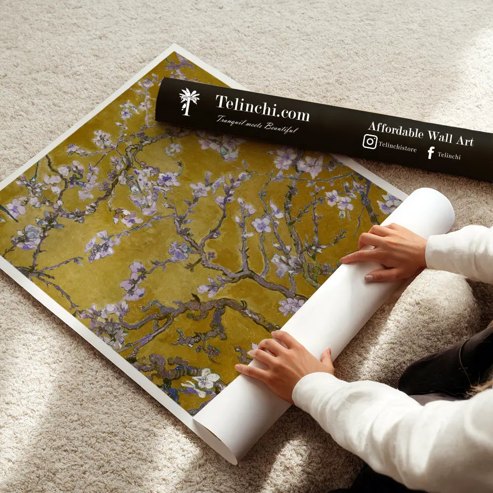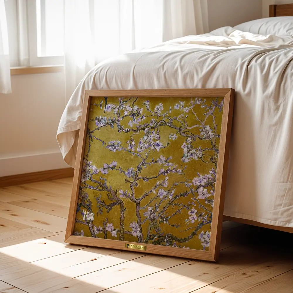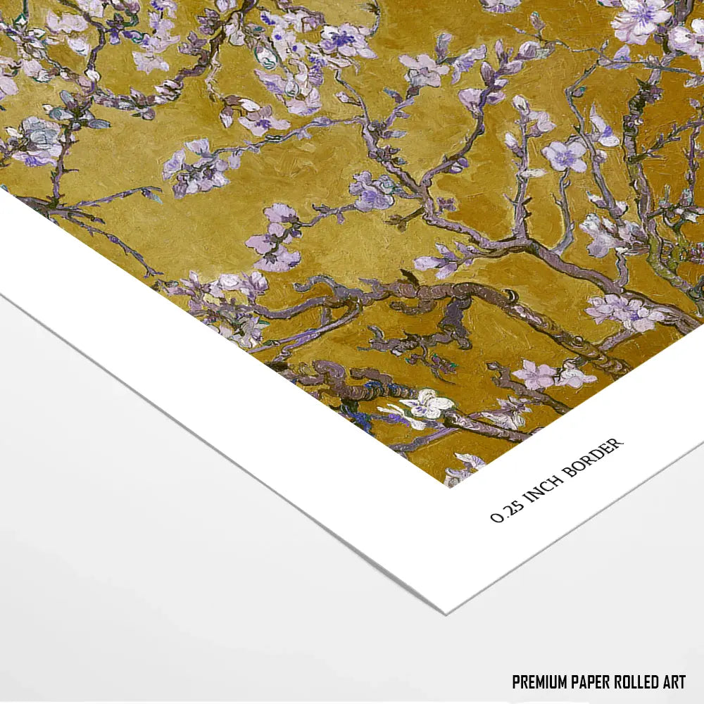 Delicate branches of blossoms set against a radiant golden background by Van Gogh