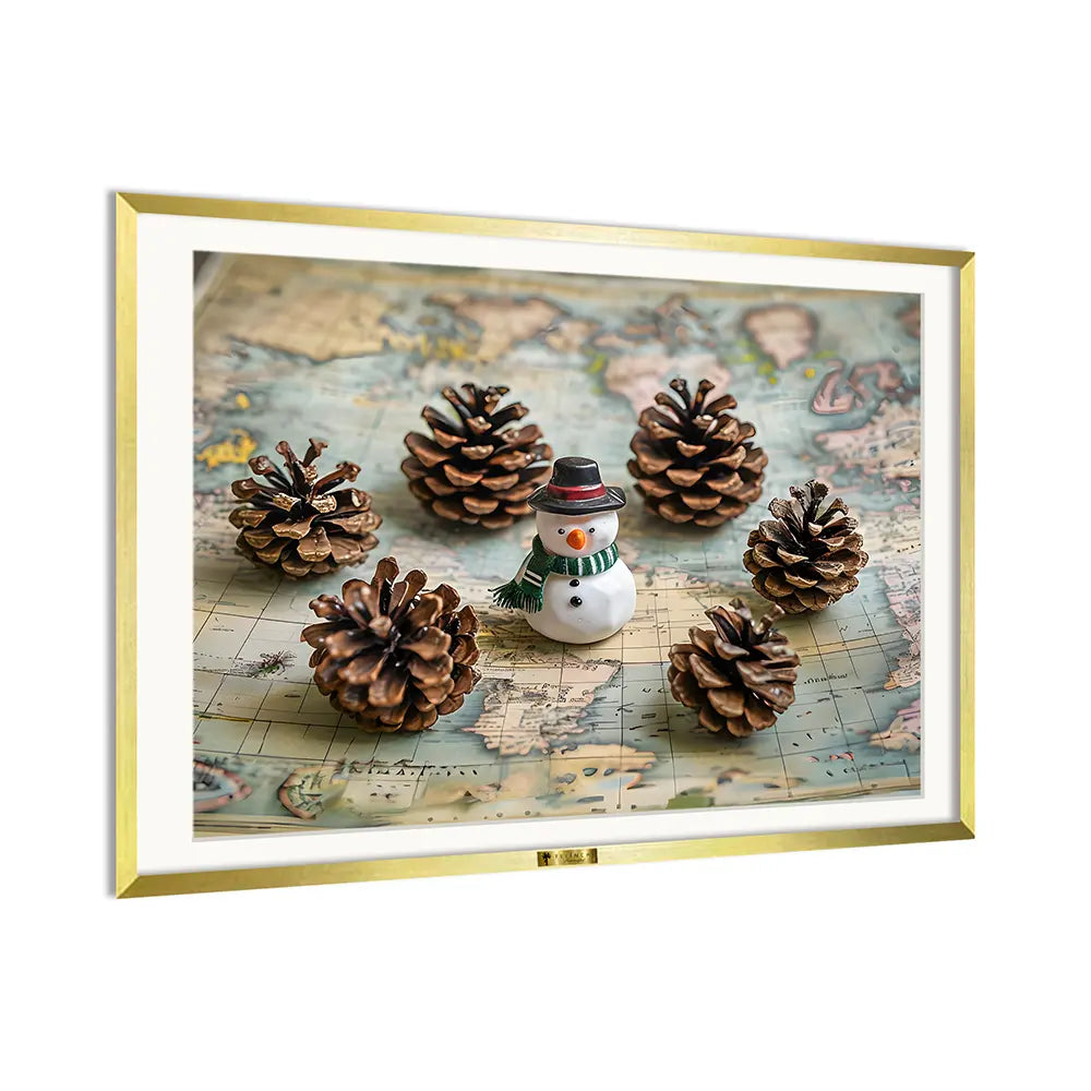 A festive arrangement of pine cones with a snowman on a world map, exuding serenity.