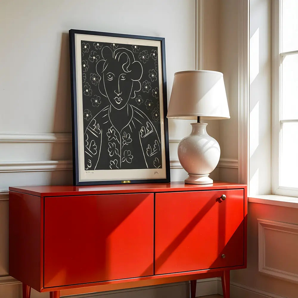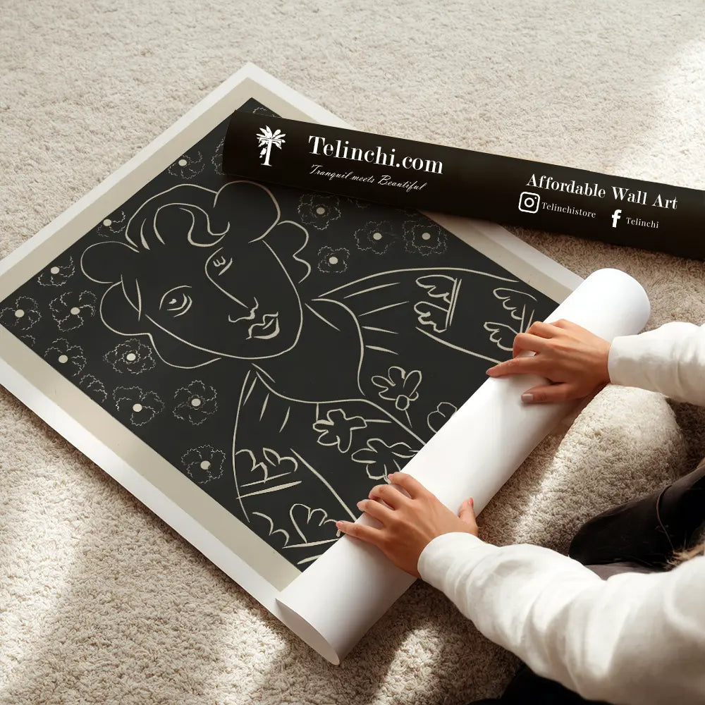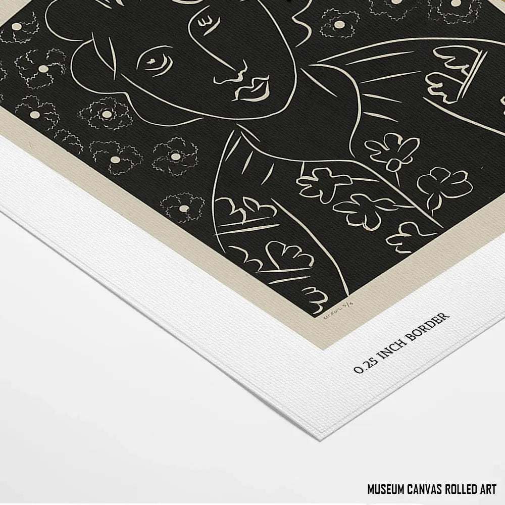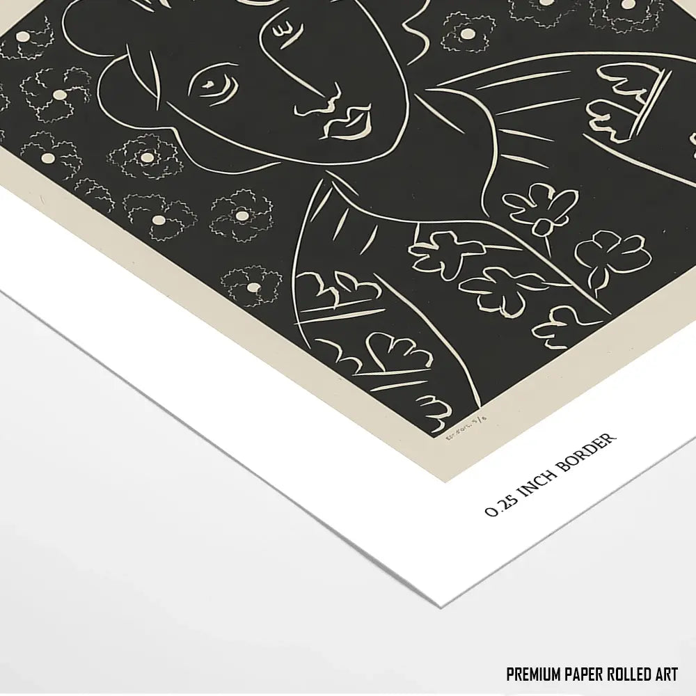 This artwork is a linocut by Henri Matisse, known for its minimalist yet expressive linework. Matisse often used this technique to explore the essence of form and expression, reducing the subject to elegant, flowing lines.