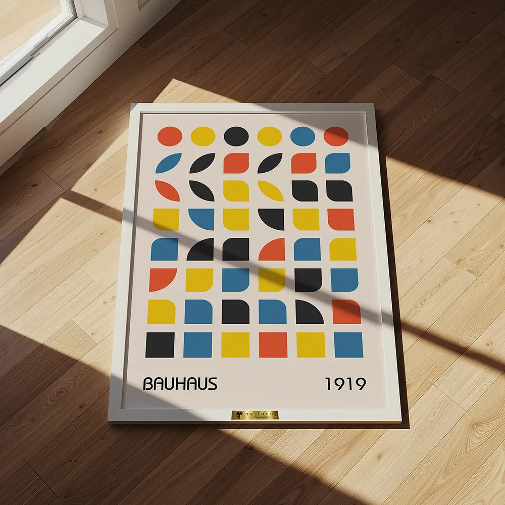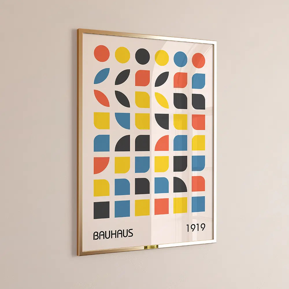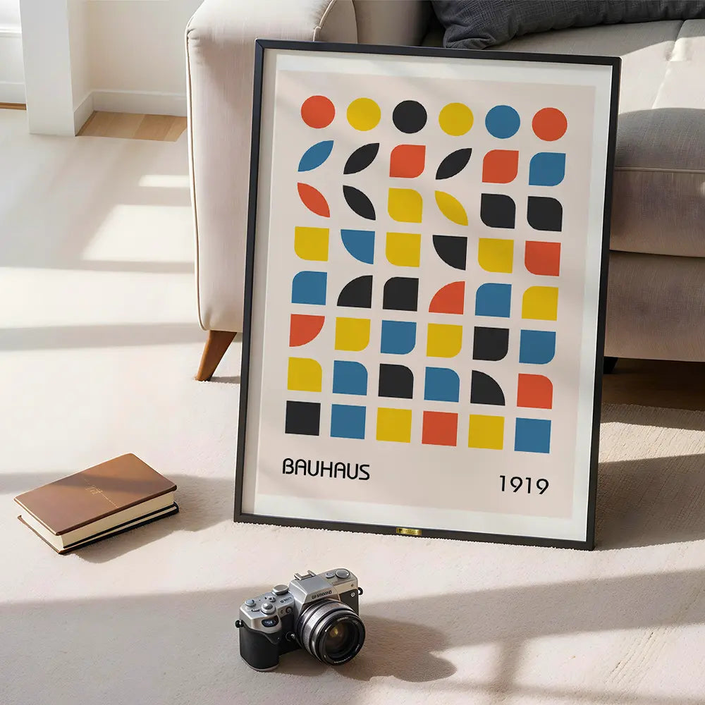 A playful array of geometric shapes and colors in classic Bauhaus style.