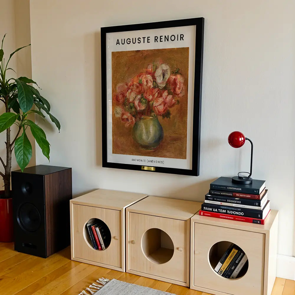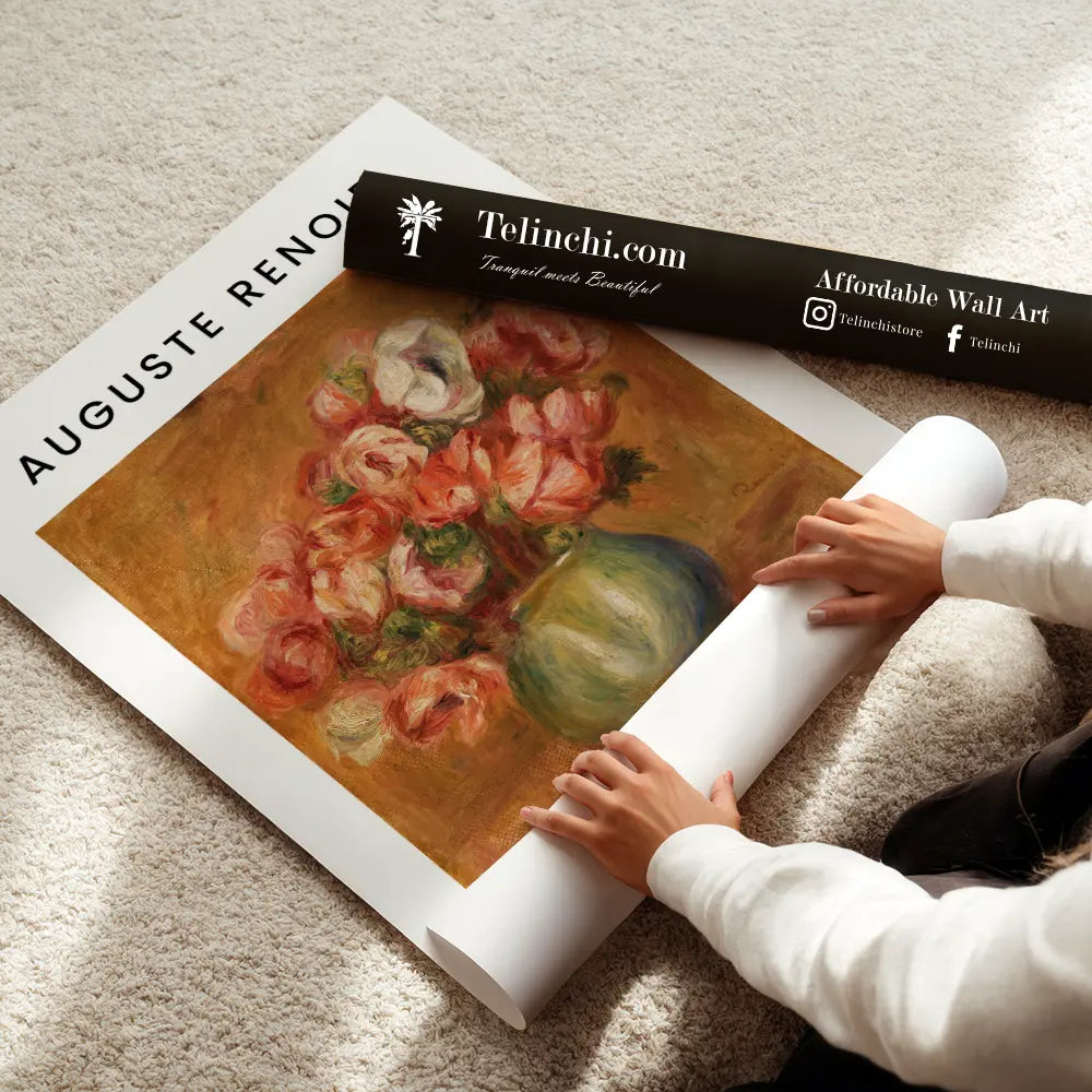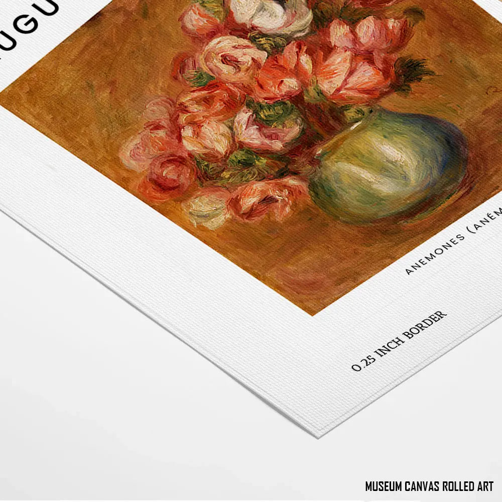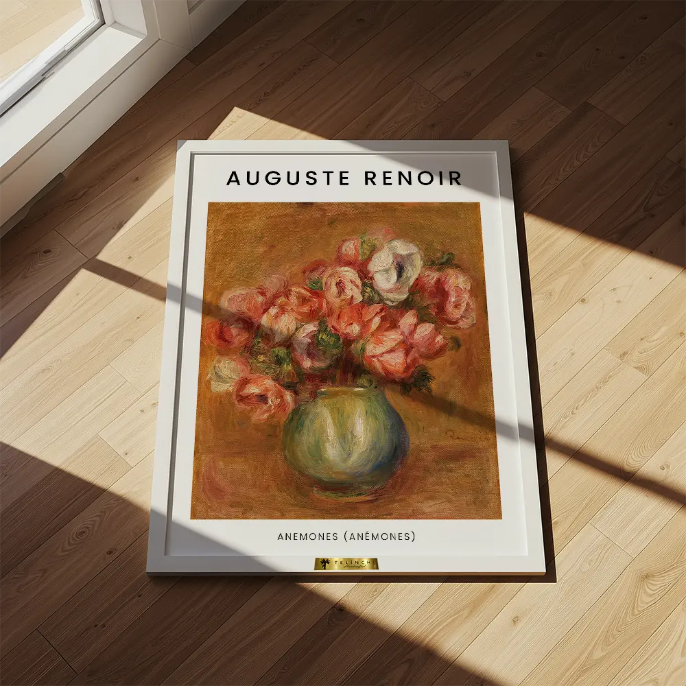 Renoir's painting showcases a vibrant bouquet of anemones in a green vase. The warm tones and impressionistic brushstrokes bring a dynamic yet serene energy to the piece. The golden background enhances the delicate and lively arrangement of flowers.