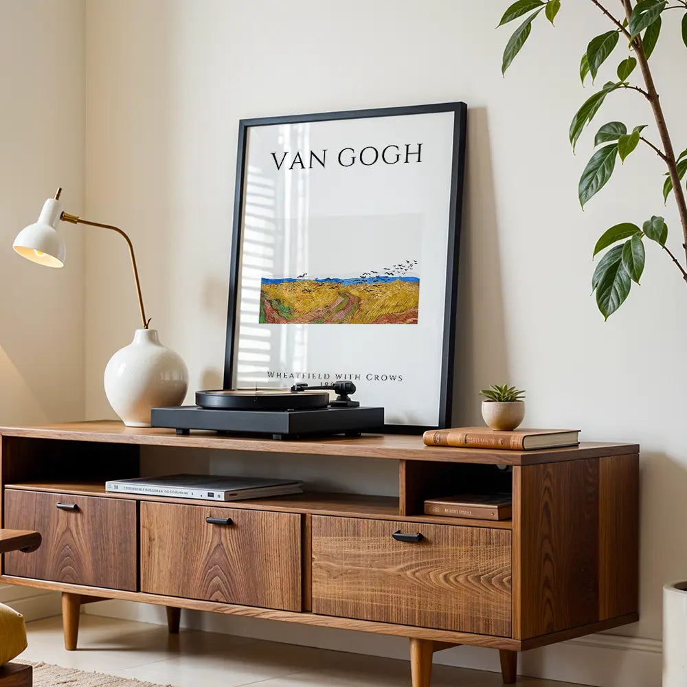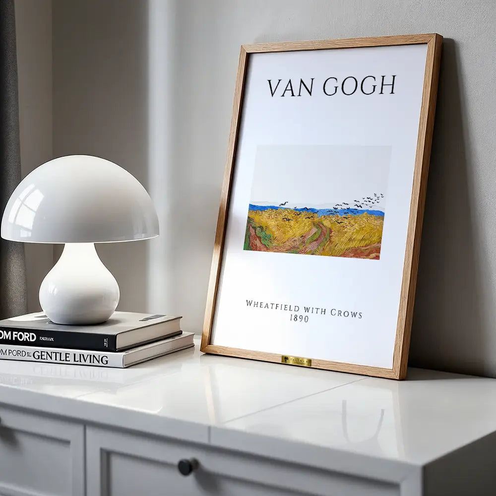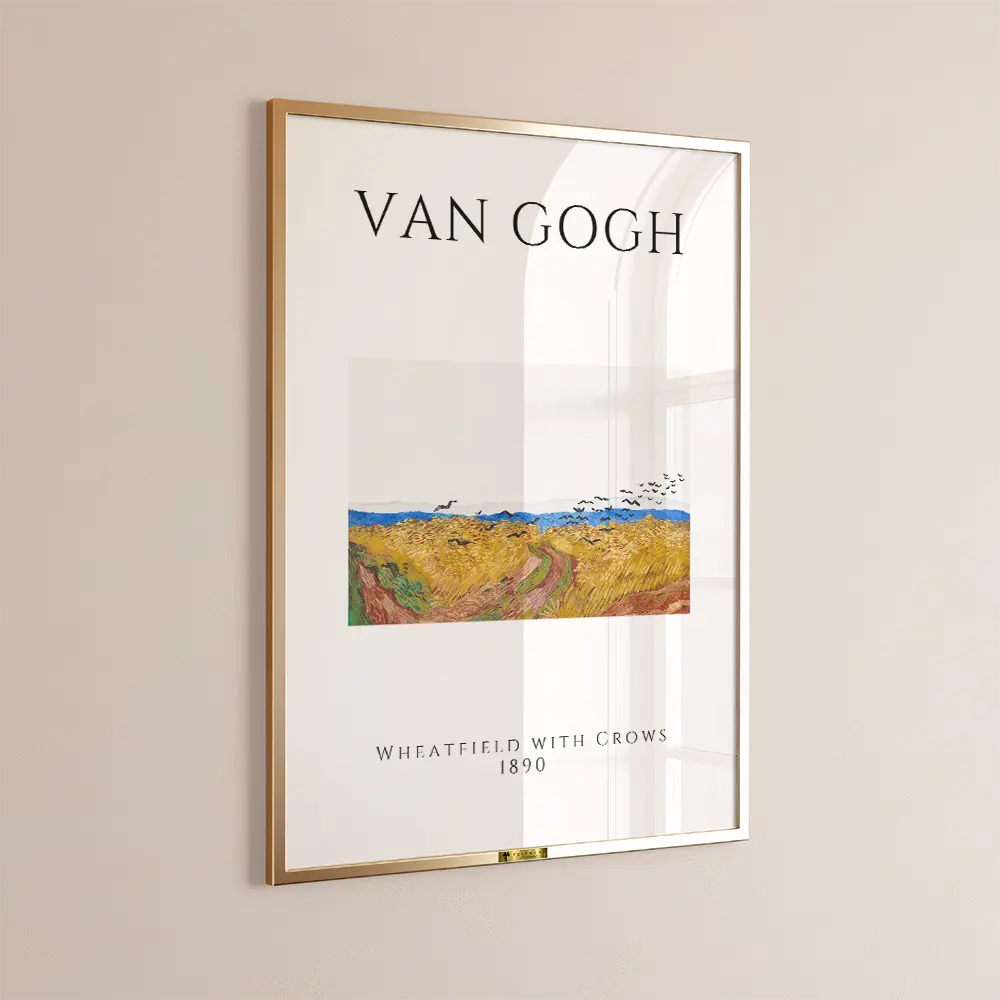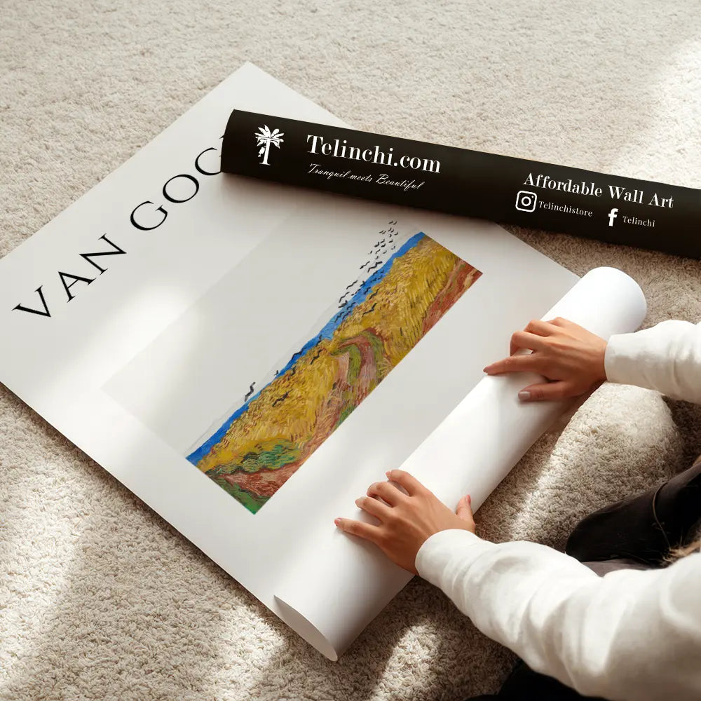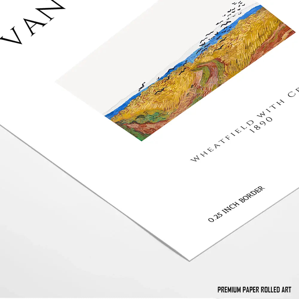 A dramatic depiction of a golden wheat field under a turbulent sky, with a winding path disappearing into the horizon. The flock of crows adds a mysterious, almost foreboding mood to the scene. Often seen as one of van Goghs final works, it embodies both beauty and melancholy.