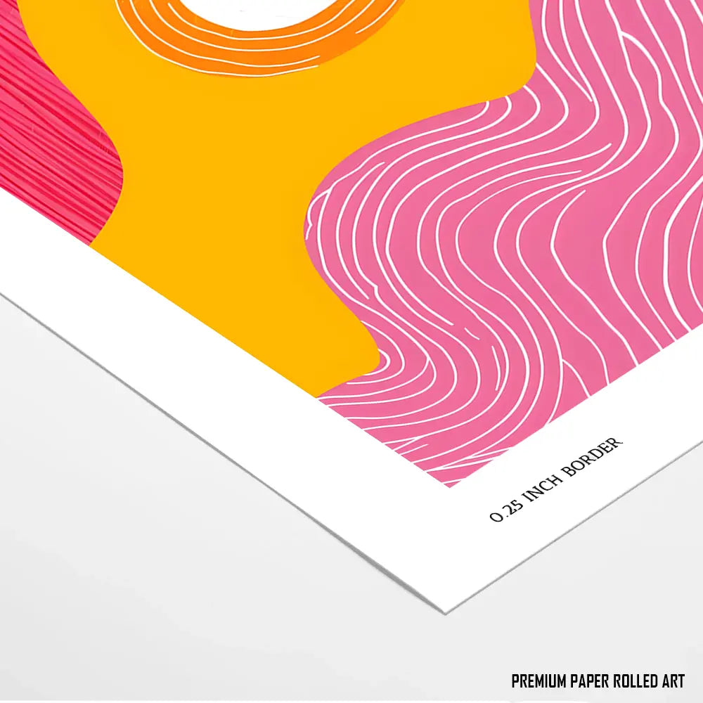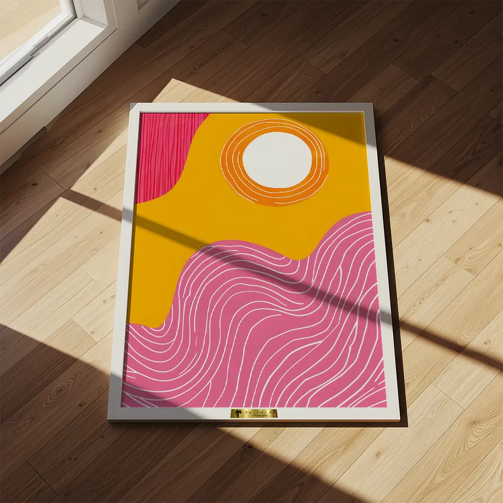 A minimal and bold sun design with flowing waves in bright pink and orange.