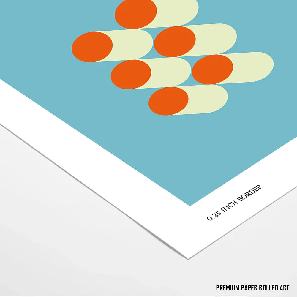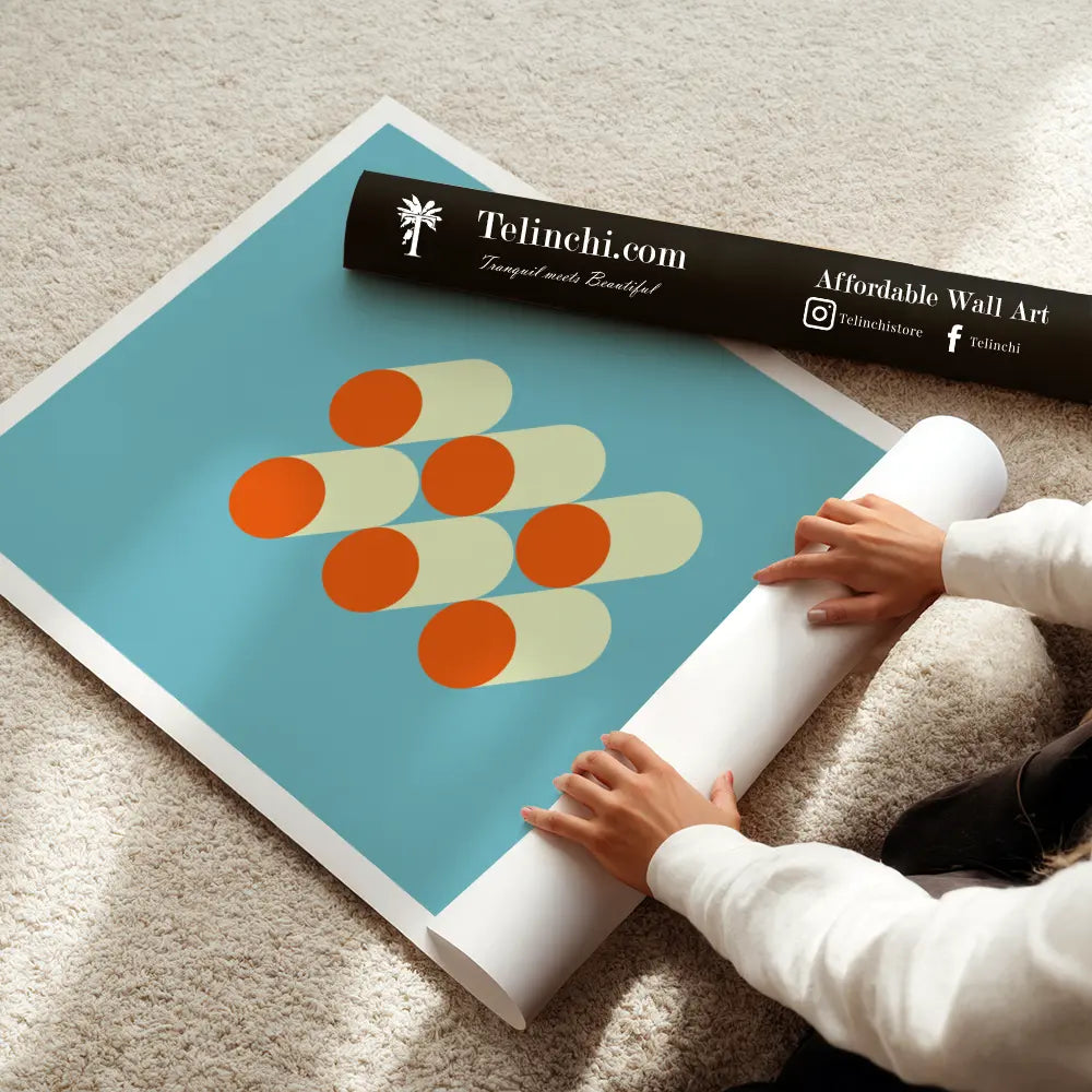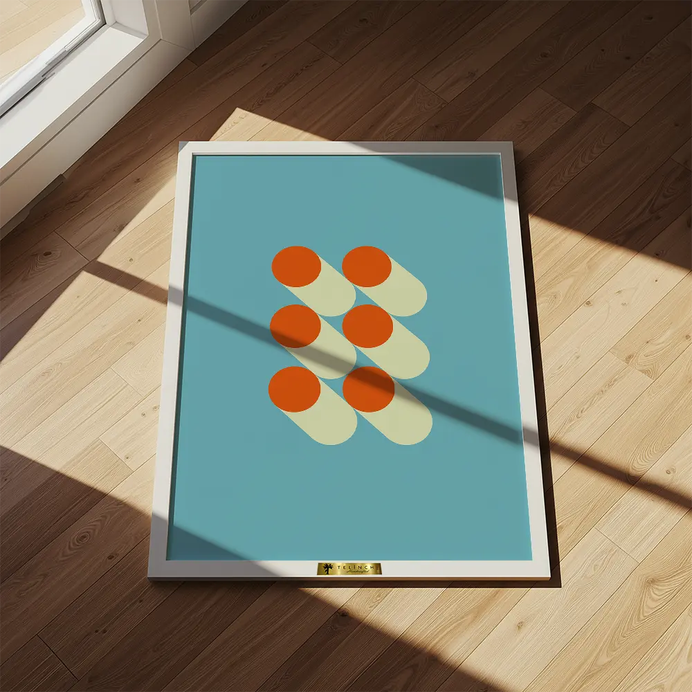 A bold and playful composition of geometric forms in bright retro colors. This minimalistic design creates a sense of balance through its symmetry and overlapping shapes. It’s both visually striking and versatile, suitable for contemporary spaces.