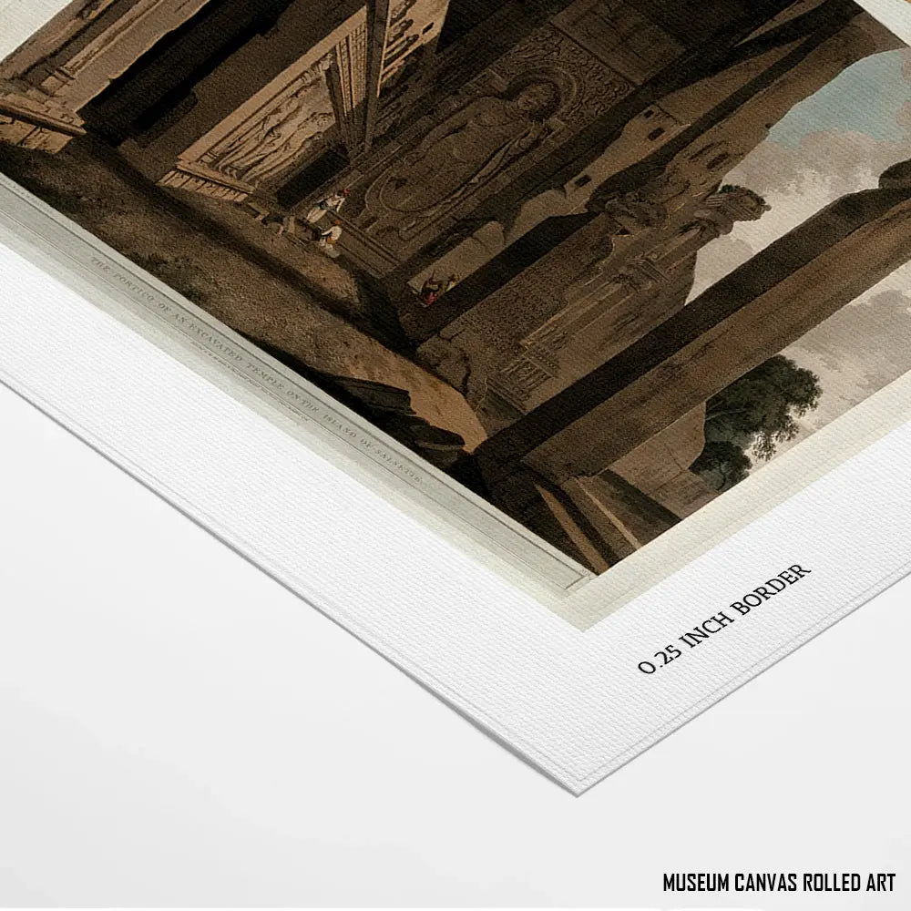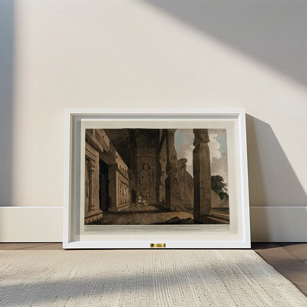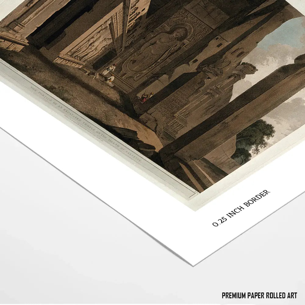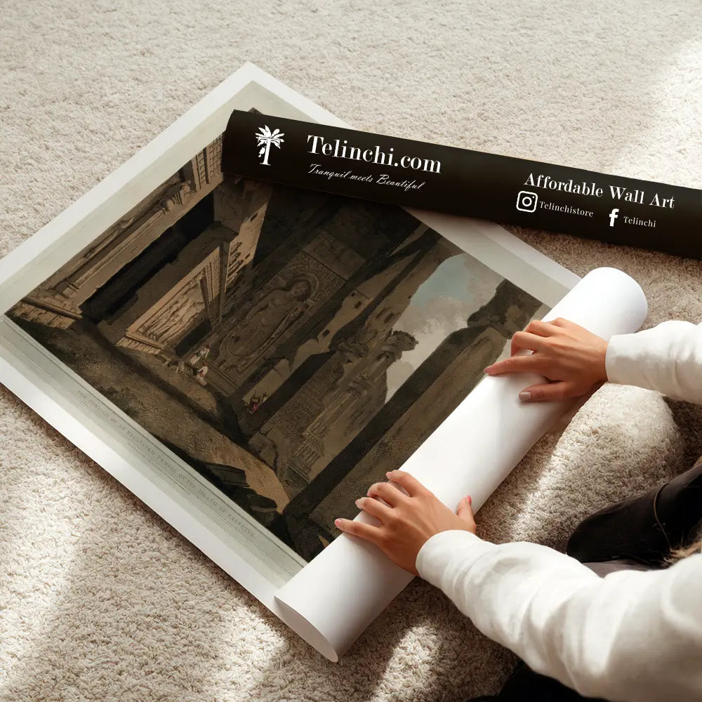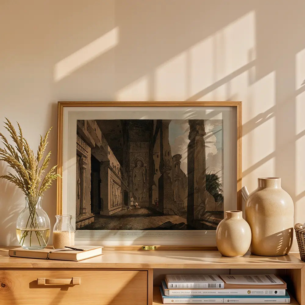 This painting showcases the magnificent Carli Caves, located near Mumbai, India. The painting highlights the impressive architecture of the Buddhist cave temple, with its towering pillars and intricate carvings. The central image of the Buddha is a focal point, surrounded by smaller figures and sculptures.