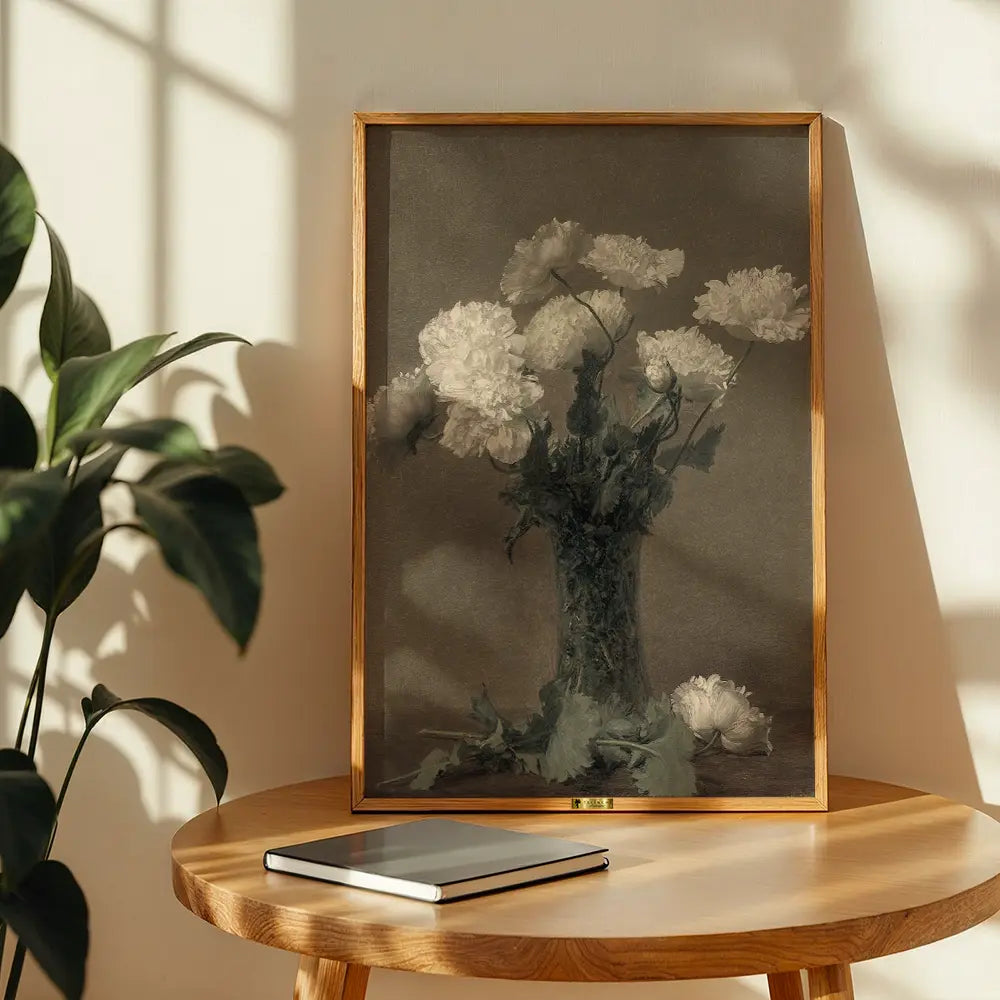 Rustic white flowers in a textured vase, perfect for moments of quiet reflection.