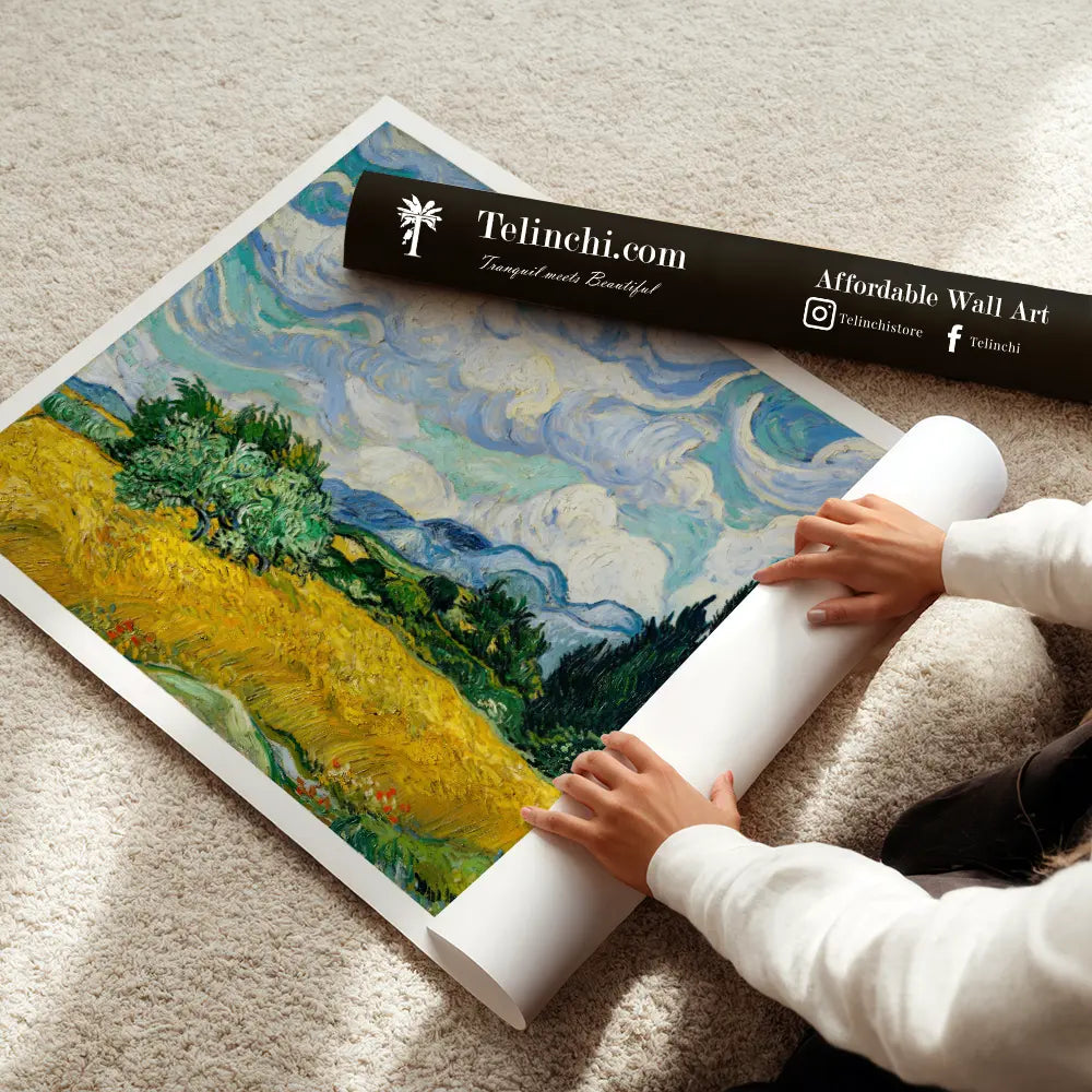 Van Gogh was fascinated by the beauty of the landscape around Arles, France, where he lived for a period. This painting captures the dramatic beauty of the Provençal countryside, with its rolling hills, golden wheat fields, and towering cypress trees.